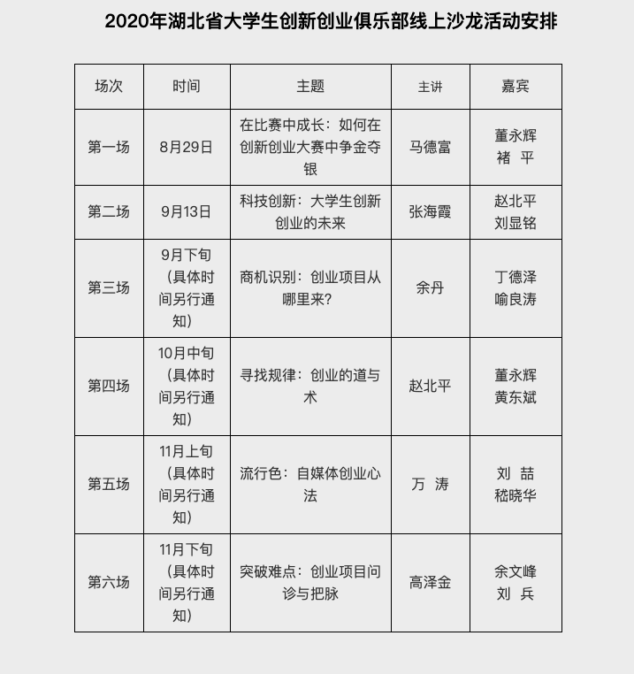 2020年湖北省大學(xué)生創(chuàng)新創(chuàng)業(yè)俱樂部線上沙龍活動安排
