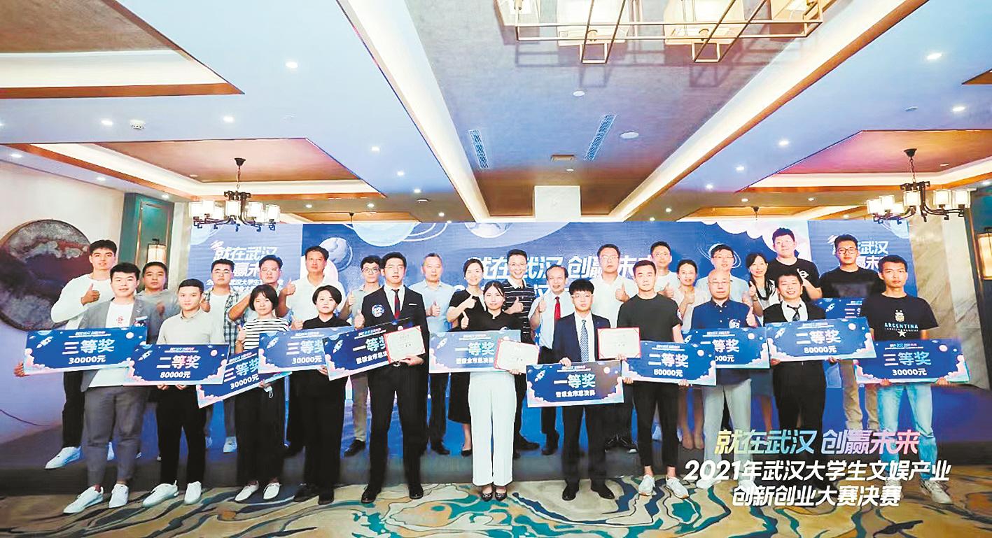 2021年武漢大學生文娛產業創新創業大賽參賽選手與評委嘉賓集體合影。(資料圖片)